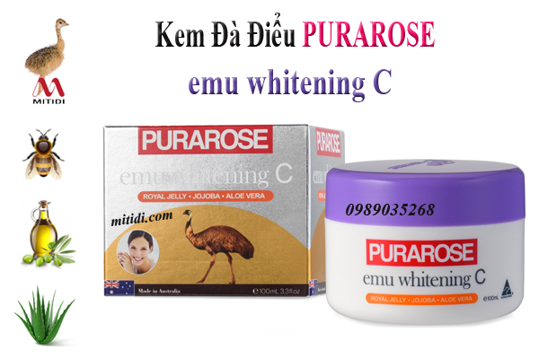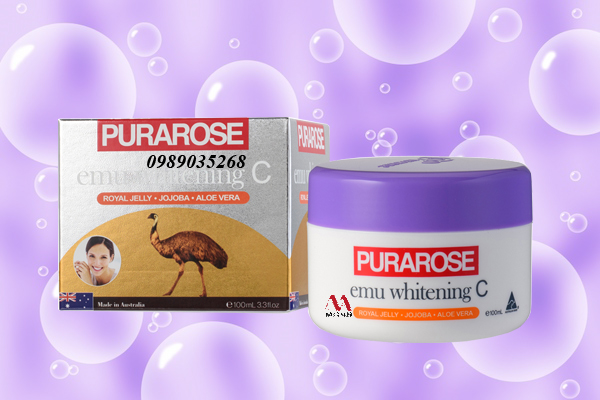 Kem dưỡng da đà điểu Purarose Emu Whitening C của Úc. Sản phẩm chứa công thức chống lão hóa, dưỡng trắng da hiệu quả cho làn da tuổi 25+, giúp cải thiện da xỉn màu, sạm đen, khô ráp, sần sùi, nếp nhăn,… ngăn ngừa các dấu hiệu lão hóa, mang lại làn da mịn màng, săn chắc, trắng sáng và tươi trẻ dài lâu.
