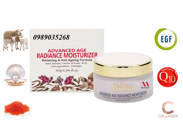 Ngoài ra, Kem trắng da Rosanna Advanced Age Radiance Moisturizer còn được bổ sung mỡ cừu, ngọc trai, yếu tố tăng trưởng EGF, Collagen và trứng cá muối giúp nuôi dưỡng làn da từ sâu bên trong, cung cấp độ ẩm cho da, tái tạo độ săn chắc, mịn màng và trắng sáng cho làn da. Kích thích tăng sinh collagen cho làn da luôn căng mịn, trẻ trung và tràn đầy sức sống.