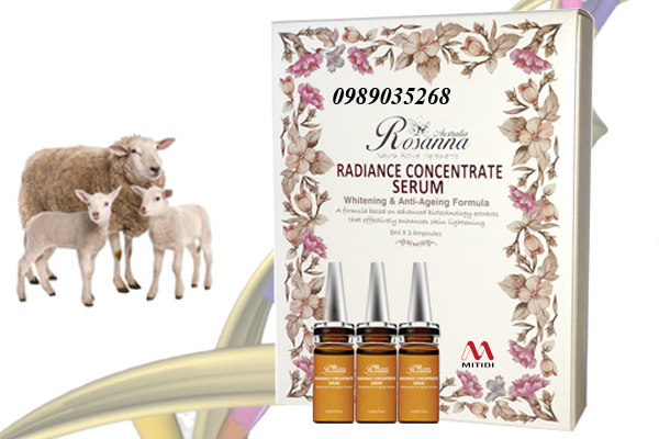 Serum làm trắng da Rosanna Radiance Concentrate của Úc. Serum Serum làm trắng da Rosanna Radiance Concentrate chiết xuất nhau thai cừu giúp làm mới tế tào da xỉn màu, nuôi dưỡng da trắng sáng từ sâu bên trong, làm mờ đi các đốm nám sạm, tàn nhang, thâm đen trên da, mang đến cho bạn làn da trắng sáng, mịn màng không tỳ vết.