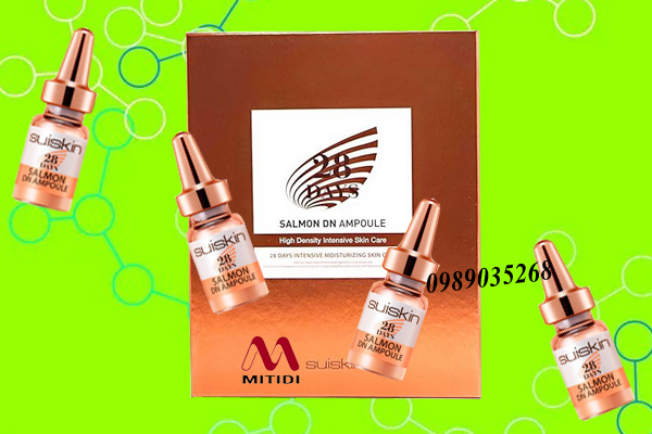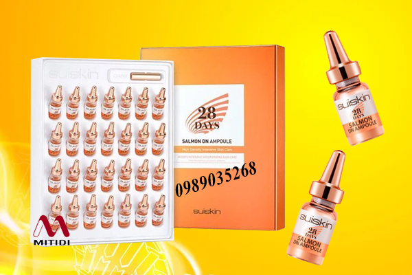 Tinh chất DNA cá hồi Suiskin 28 days Salmon DN Ampoule của Hàn Quốc. Tinh chất DNA cá hồi Suiskin chống lão hóa da như nám, tàn nhang, nếp nhăn, da sần sùi, khô ráp,… mang lại cho bạn làn da khỏe mạnh, mịn màng, trắng hồng rạng rỡ.