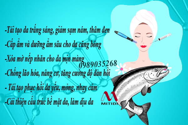 Tinh chất tiêm cấy căng bóng da DNA cá hồi giúp tái tạo làn da, thay thế tế bào chết già cỗi, kích thích tăng sinh collagen hình thành làn da mới căng bóng, trẻ trung, mịn màng và trắng sáng.