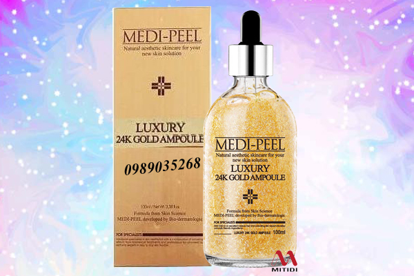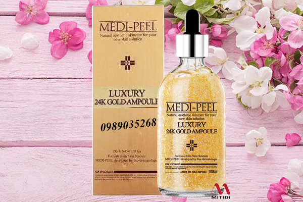 Tinh chất vàng 24k Medi Peel Luxury 24K Gold Ampoule của Hàn Quốc chứa tinh thể vàng nguyên chất 24K cùng các hoạt chất quý giá giúp nuôi dưỡng làn da khỏe mạnh, căng mịn, tái tạo độ đàn hồi từ bên trong để xóa bỏ các nếp nhăn, nám sạm và các dấu hiệu lão hóa khác.