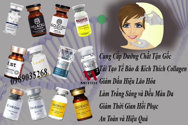 Trong sản phẩm dùng cấy Meso ứng dụng công nghệ chiết xuất tinh chất thiên nhiên, chứa nhiều chất tế bào gốc Exosome, DNA, PDRN, Hyaluronic Acid, Glutathione, Tranexamic Acid, Collagen,Vitamin C, Peptides, Acid Amins.... cung cấp độ ẩm cho làn da căng bóng, sáng mịn và tươi trẻ, giúp tăng cường sức đề kháng làn da, thải độc da, kháng viêm, tạo lớp màng bảo vệ da khỏi tác hại ánh nắng mặt trời để duy trì làn da trắng sáng, căng bóng, khỏe mạnh, tươi trẻ dài lâu.