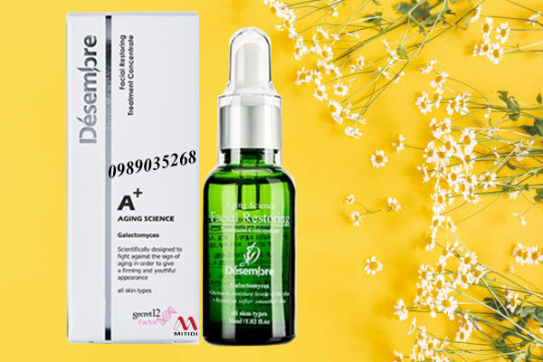 Tinh chất dưỡng da căng bóng Desembre Restoring Treatment Concentrate của Hàn Quốc chiết xuất từ nấm men vi sinh tự nhiên chứa nhiều dưỡng chất quý giá giúp nuôi dưỡng, tái tạo làn da mịn màng, căng bóng và trắng sáng bất ngờ. Sản phẩm tinh chất dễ thẩm thấu, phù hợp với mọi loại da, kể cả da nhạy cảm.