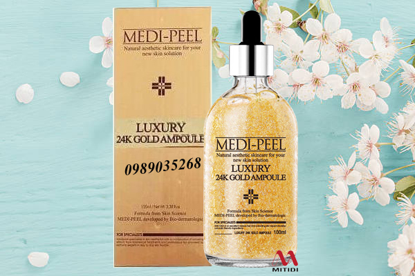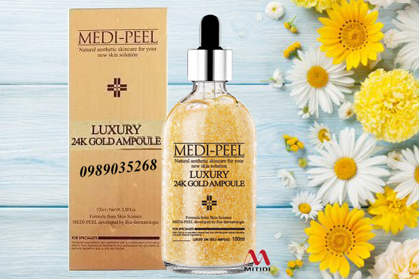 Tinh chất Medi Peel Luxury 24k Gold Ampoule 100ml của Hàn Quốc chứa tinh chất vàng 24K đậm đặc cùng các dưỡng chất quý giá giúp nuôi dưỡng, tái tạo làn da săn chắc, mịn màng; giảm hẳn các nếp nhăn, đường nhăn và các dấu hiệu lão hóa, cho làn da tươi trẻ, căng tràn sức sống.