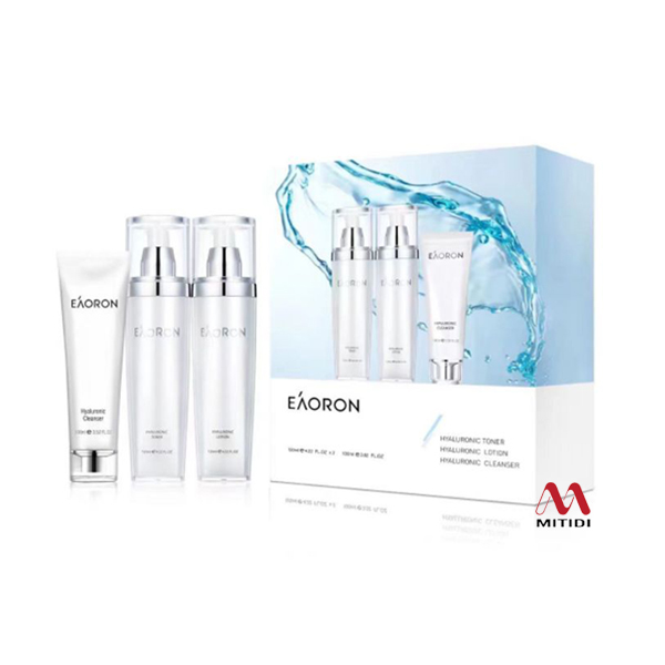 Set dưỡng da Eaoron Hyaluronic 3 in 1 chủ yếu làm bằng Hyaluronic Acid có tác dụng cấp ẩm cho da và giảm nếp nhăn và làm cho làn da mịn màng và thông thoáng.
