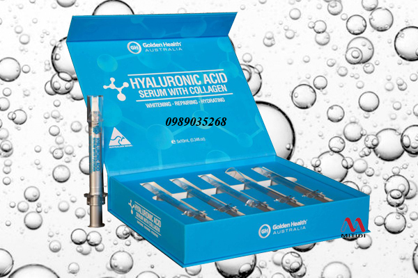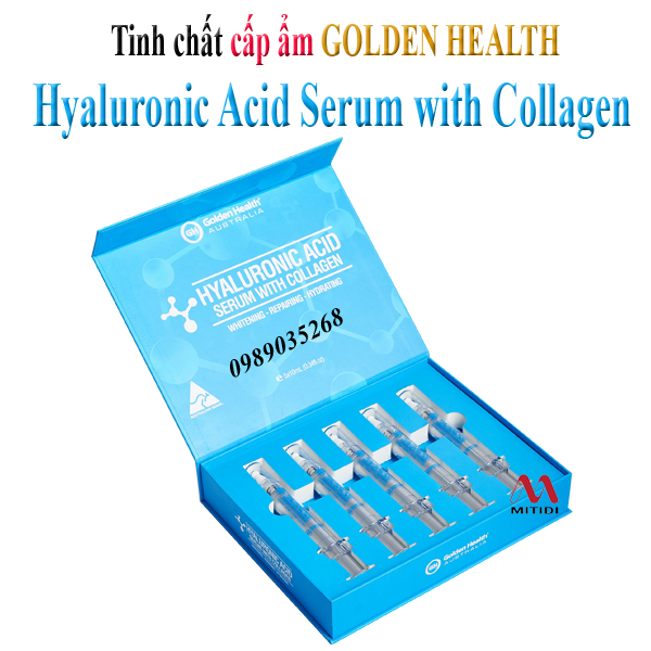 Tinh chất cấp ẩm Hyaluronic Acid Serum with Collagen Golden Health làm mềm những nếp nhăn với sức mạnh của Hyaluronic Acid, collagen để điều chỉnh hydrat hóa, giữ ẩm và bảo vệ da khỏi các yếu tố bên ngoài.