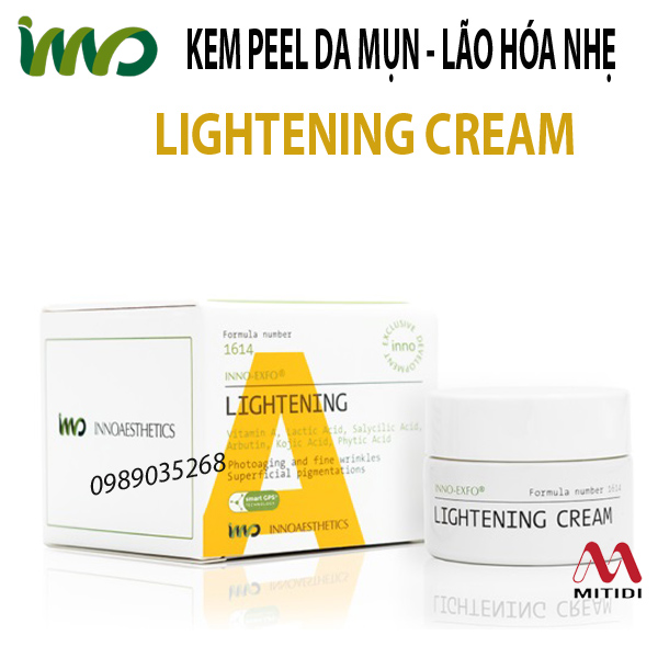 Kem peel da mụn Innoaesthetics Lightening Cream tẩy tế bào chết bằng cách sử dụng vitamin A như một yếu tố chống lại sự hình thành thâm sạm ở cấp độ I và II liên quan đến sắc tố nhẹ và làm sach tình trạng mụn ẩn và bít tắc.