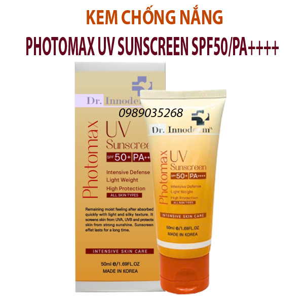 Kem chống nắng Dr.Innoderm Photomax UV Sunscreen SPF50+ PA++++ giúp chống nắng tuyệt đối cho làn da bị hư tổn, xâm lấn và dễ bắt nắng sau các liệu trình làm đẹp, ngăn chặn tia cực tím gây tổn hại đến da để phòng tránh xuất hiện cách vết nám thâm trên da.