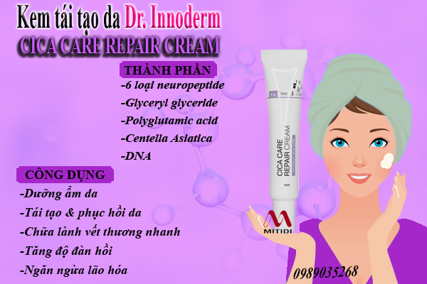 Kem dưỡng tái tạo da Dr Innoderm Cica Care Repair Cream làm dịu da khô, giảm kích ứng, bảo vệ da bị tổn thương và phục hồi làn da. Giúp dưỡng ẩm cho làn da nhạy cảm sau khi điều trị. Tăng khả năng chữa lành vết thương nhanh chóng và độ đàn hồi của da.