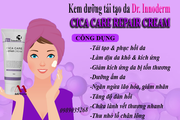 Kem dưỡng tái tạo da Dr Innoderm Cica Care Repair Cream làm dịu da khô, giảm kích ứng, bảo vệ da bị tổn thương và phục hồi làn da. Giúp dưỡng ẩm cho làn da nhạy cảm sau khi điều trị. Tăng khả năng chữa lành vết thương nhanh chóng và độ đàn hồi của da.