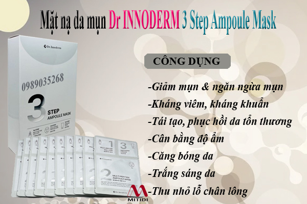 Mặt nạ Dr.Innoderm da mụn – 3 Step Ampoule Mask dùng thải mụn và thâm sau mụn, tái tạo da yếu, phục hồi da sau tổn thương do lấy nhân mụn, nhỏ lỗ chân lông, kiểm soát bã nhờn, căng bóng và giữ ẩm, kháng viêm, kháng khuẩn, bảo vệ da không bị mụn quay lại.