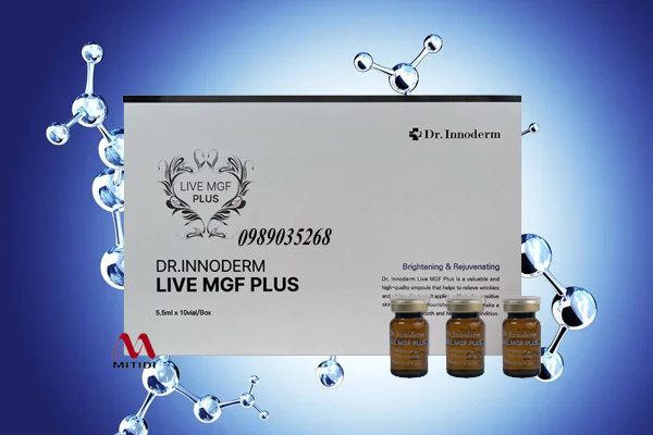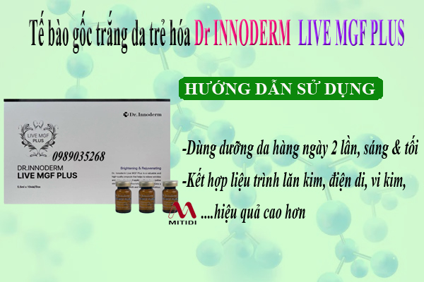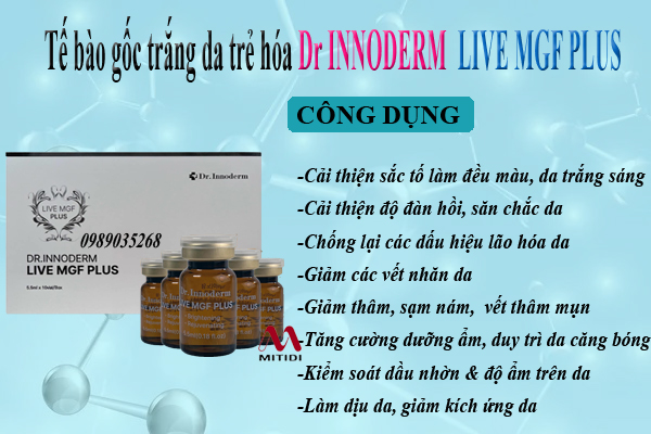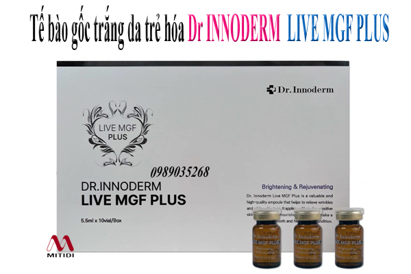 Tinh chất trắng da trẻ hóa Dr.Innoderm Live MGF PLUS giúp làm mờ nếp nhăn, tăng cường chống lại các dấu hiệu của lão hóa da, loại bỏ nám, tàn nhang, làm mờ vết thâm, tái tạo làn da trắng sáng mịn màng.