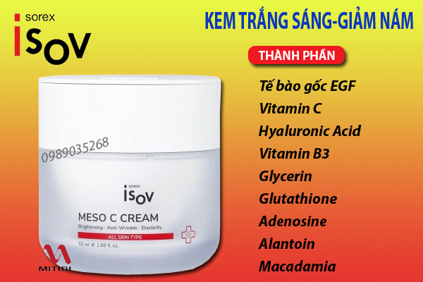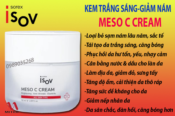 Kem giảm nám trắng da Meso C Cream iSOV dùng dưỡng hàng ngày giúp cải thiện nám, dưỡng trắng, cấp ẩm và giúp da tươi sáng, khỏe mạnh, tràn đầy sức sống.