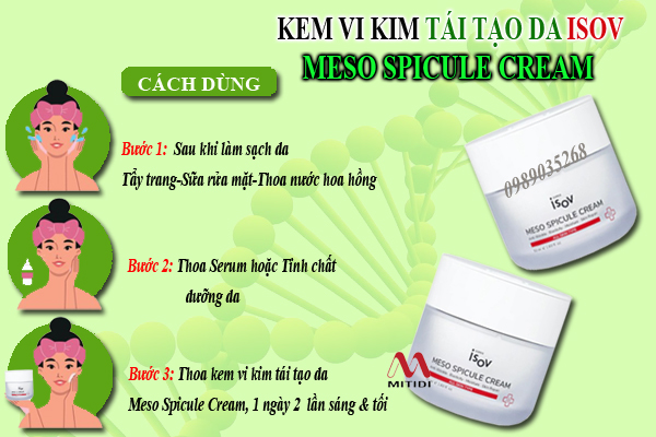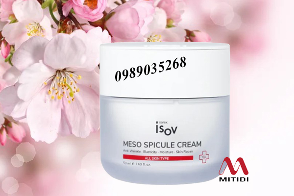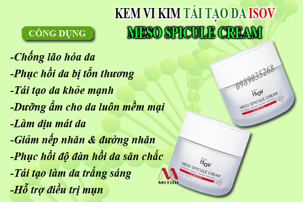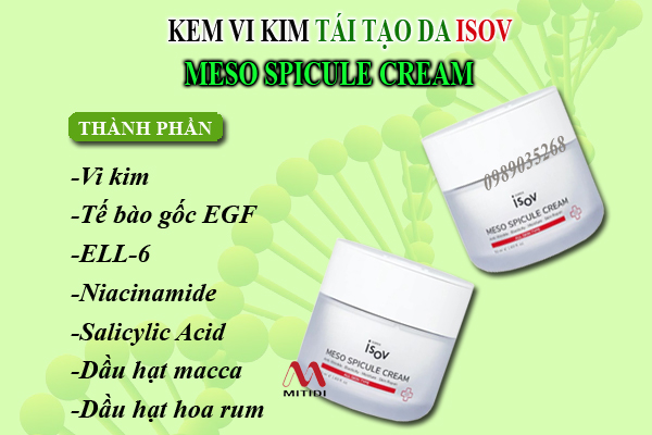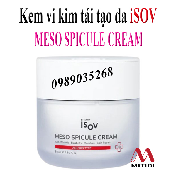 Kem vi kim tái tạo da iSOV Meso Spicule Cream là loại kem đặc biệt được tạo ra từ các mũi kim siêu nhỏ sẽ đi sâu xuống lớp đáy biểu bì, kích thích quá trình tăng sinh tế bào mới, thải độc tố, sửa chữa hư tổn da liên tục trong 72h. Thúc đẩy quá trình thay da tự nhiên giúp tái tạo da, mờ nếp nhăn, điều trị mụn, trắng sáng da.