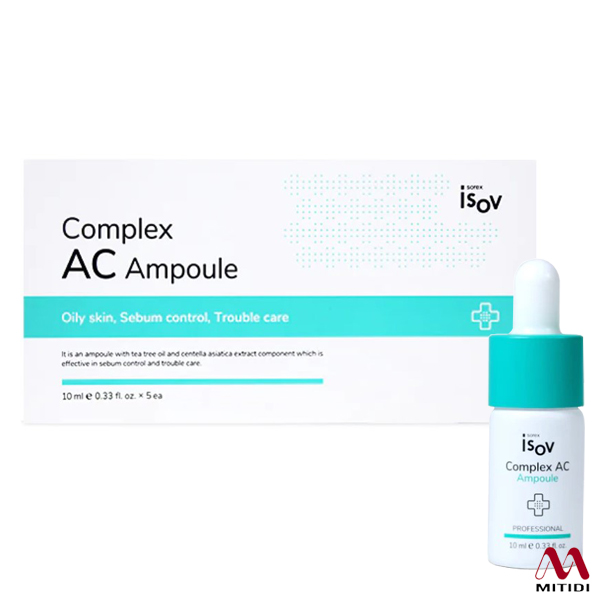 Serum mụn iSOV Complex AC Ampoule là loại ampoule làm dịu da với hàm lượng lưu huỳnh thực vật, dầu cây trà và thành phần BHA, đồng thời có hiệu quả trong việc kiểm soát bã nhờn và chăm sóc các vấn đề da có mụn.