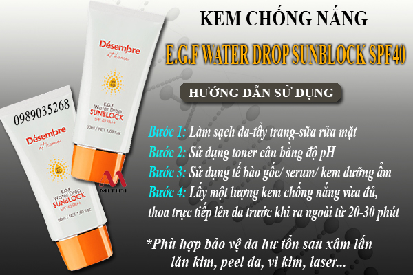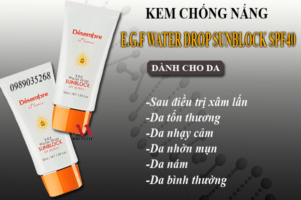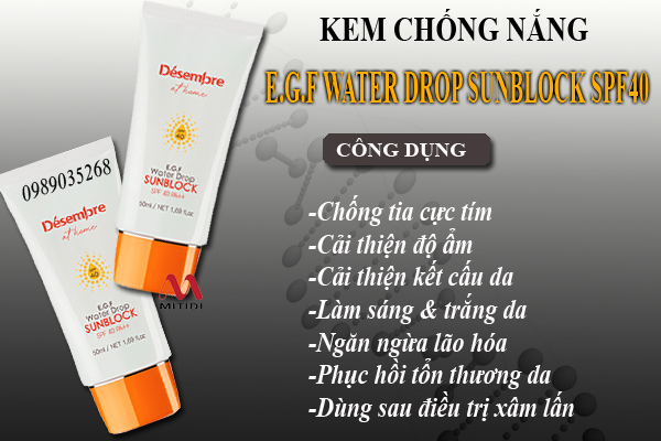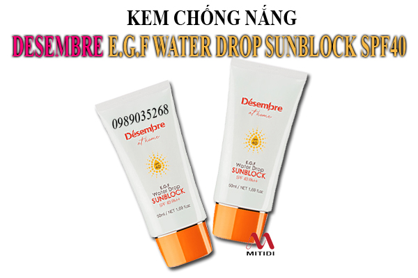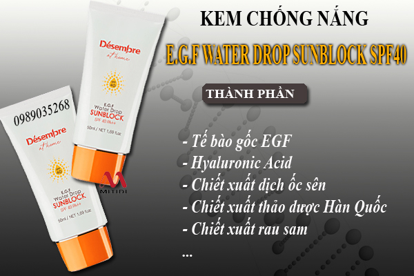 Kem chống nắng Desembre at home E.G.F Water Drop Sunblock SPF40 chứa thành phần yếu tố tăng trưởng giúp kích thích sự phát triển của các tế bào da mới, chống lão hóa,tăng đàn hồi và giảm nếp nhăn, làm giảm sắc tố melamin trong da, giúp giảm vết thâm nám trên da.