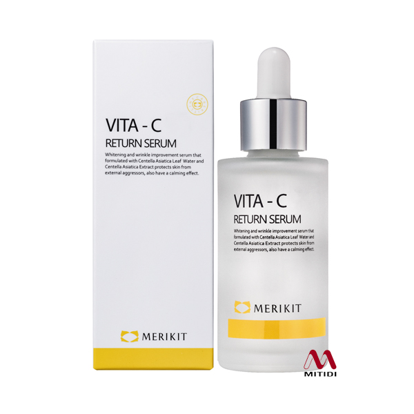 Serum trắng da Merikit Vita C Return Serum với các thành phần trắng da từ thiên nhiên như: nước rau má, chiết xuất chanh, chiết xuất dâu rừng…. Giúp làm trắng da tự nhiên và ngăn ngừa tia UV làm sạm da. Nước lá rau má giúp làm dịu và giảm kích ứng cho da. Tinh chất dâu rừng dồi dào Polyphenols, anthocyanins, Vitamins, Omega 3..vv….. giúp da trắng tự nhiên, đồng thời cấp ẩm và làm dịu làn da.