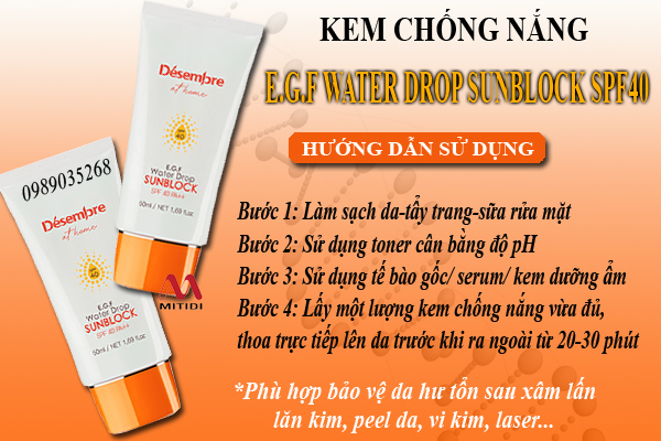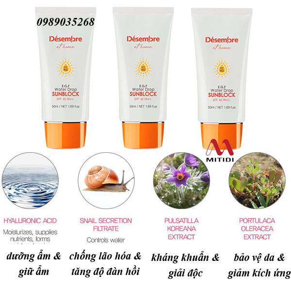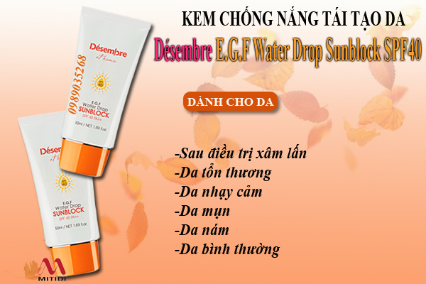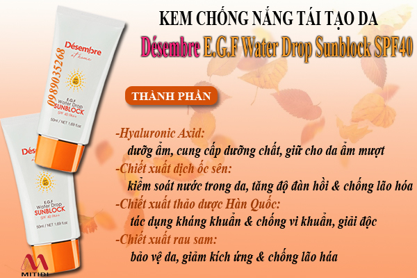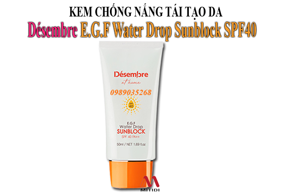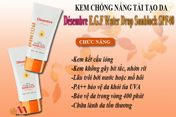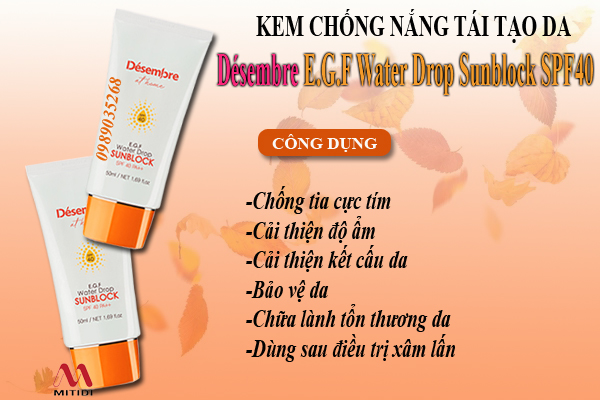 Kem chống nắng Desembre at home E.G.F Water Drop Sunblock SPF40 chứa thành phần yếu tố tăng trưởng giúp kích thích sự phát triển của các tế bào da mới, chống lão hóa,tăng đàn hồi và giảm nếp nhăn, làm giảm sắc tố melamin trong da, giúp giảm vết thâm nám trên da.