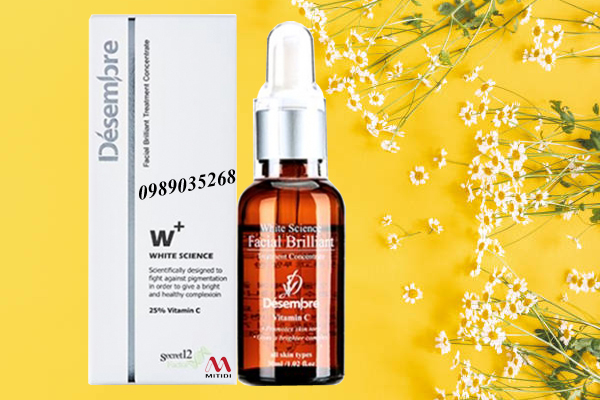 Tinh chất trắng da giảm nám Desembre Briliant Treatment Concentrate chứa hàm lượng Vitamin C ổn định ở mức pH 3~4 không gây kích ứng. Có tác dụng cao vì chứa đến 25% Vitamin C nên được hấp thu trực tiếp vào da. Loại bỏ các gốc tự do và ngăn ngừa tổn thương các tế bào do các vật chất gây hại, mang lại một làn da trắng sáng tuyệt vời. Cung cấp độ ẩm và tăng sức đề kháng cho da khỏe mạnh.