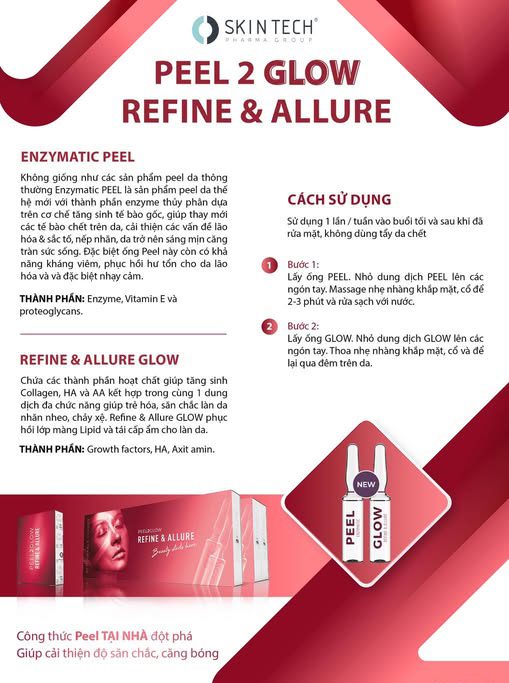 Peel REFINE & ALLURE SKINTECH Kit 10 trẻ hóa, phục hồi da chuyên sâu, là bộ sản phẩm chăm sóc da chuyên sâu, được thiết kế để cải thiện kết cấu da, tăng cường độ ẩm, và làm sáng da. Bộ sản phẩm gồm 2 bước: Enzymatic Peel và Refine & Allure Glow.