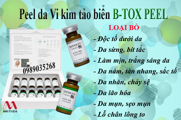 Vi tảo B Tox Peel thay da sinh học là công nghệ Peel tảo sinh học Silic được xem là phương pháp Dermasbrasion (mài da sinh học) có tác dụng hiệu ứng tái sinh da bao gồm các thành phần khoáng chất có trong tự nhiên của vi tảo Silic đi sâu vào lớp da vừa có tác dụng đào thải độc tố chất bẩn, vừa nuôi collagen & elastin, cung cấp các thành phần mà bất kỳ tảo nào cũng có: vitamin B1, B2, B3 (nuôi da, tăng sinh protein làm đầy), kẽm, vi lượng, caroten, selenium (ngăn ngừa lão hóa), magie, vitamin E, amino axit béo, các vi lượng, …