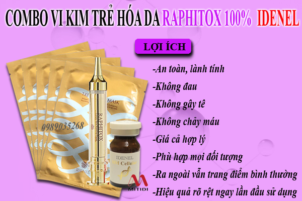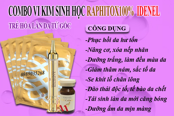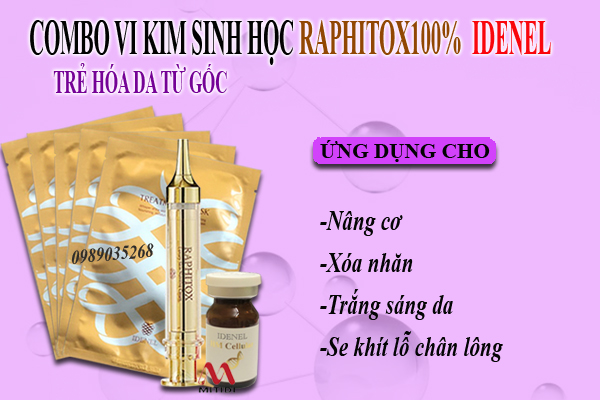 Vi kim sinh học Nano Luxury Raphitox 100% Idenel. Raphitox là công nghệ điều trị da bán xâm lấn. Nguyên liệu chính của vi kim Raphitox được chiết xuất từ thực vật. Áp suất và công nghệ nano giúp nén dưỡng chất và tế bào gốc thành hình kim. Khi massage lên da, những vi kim này đi vào lớp đáy của biểu bì. Tạo ra báo động giả rằng da đang gặp tổn thương để bạch cầu xuất hiện và giải phóng các vi kim. Từ đó, dưỡng chất tràn ra và thẩm thấu nuôi dưỡng tế bào.