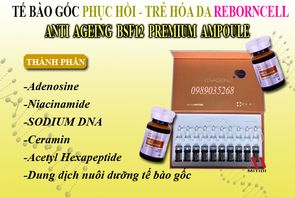Tinh chất cải thiện sẹo Reborncell Anti Ageing BSF12 Premium Ampoule dành cho da dầu có chứa adenosine. Cấu trúc của Adenosine bao gồm một phân tử adenine và một phân tử ribore. Adenosine tồn tại trong các loại thảo dược quý hiếm như đông trùng hạ thảo và linh chi…