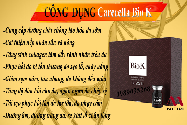 Tinh chất trẻ hóa da Carecella Bio K Carecella Bio K giúp làm mờ nếp nhăn, tăng cường chống lại các dấu hiệu của lão hóa da, loại bỏ nám, tàn nhang, làm mờ vết thâm, tái tạo làn da trắng sáng mịn màng.