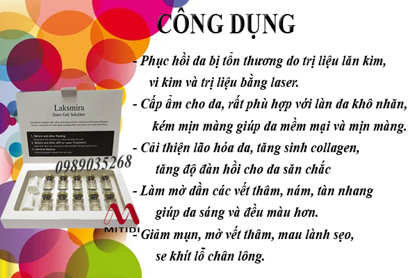 - Có thể dùng Laksmira Stem Cell Solution để lăn kim hoặc sau lăn kim, vi kim, vi tảo, trị liệu bằng laser... để phục hồi nhanh chóng cấu trúc tế bào da.