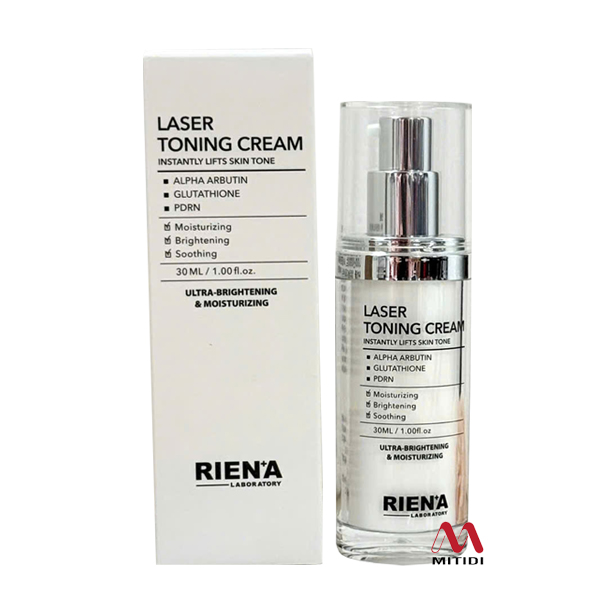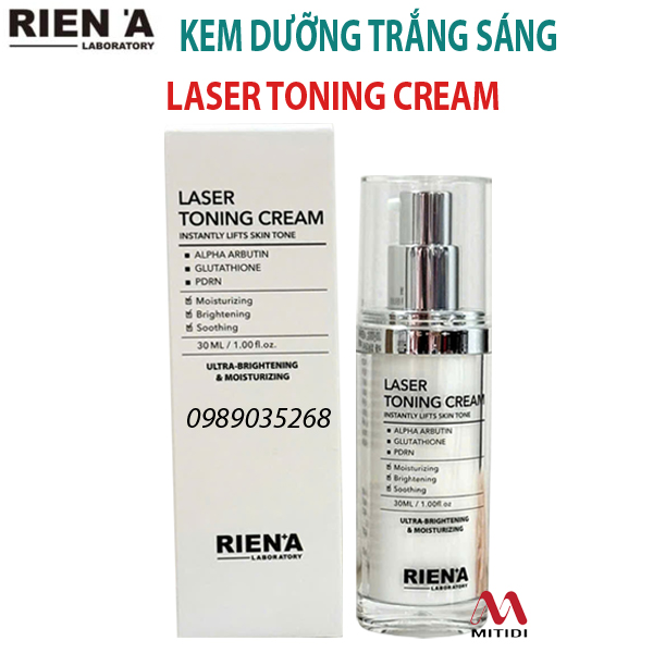 Kem dưỡng trắng da Rien'A LASER TONING CREAM là sản phẩm kem dưỡng trắng da và nâng tone da có tác dụng làm mờ thâm nám, tàn nhang.