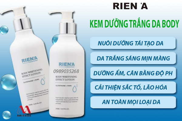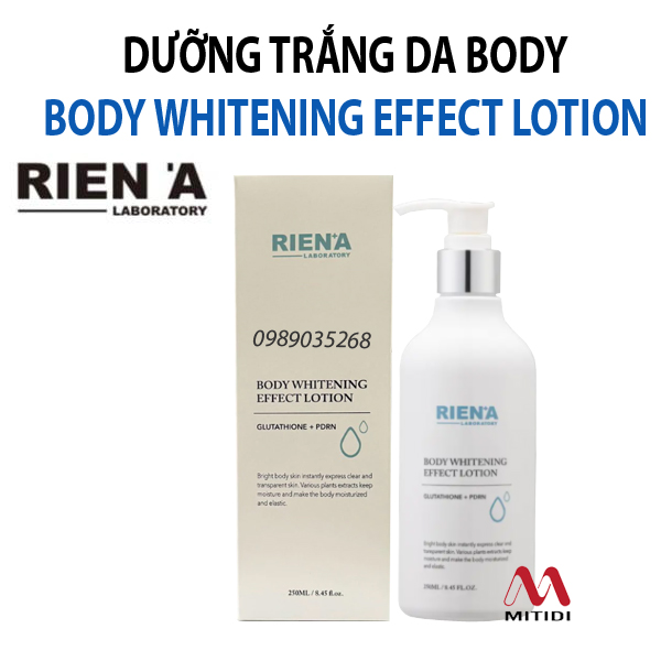Lotion dưỡng trắng da Rien'A BODY WHITENING EFFECT LOTION nhanh thấm vào da, nuôi dưỡng tái tạo làn da. Cấp ẩm cho da, ngăn ngừa các tình trạng khô da, Cải thiện sắc tố da đem đến làn da trắng sáng.