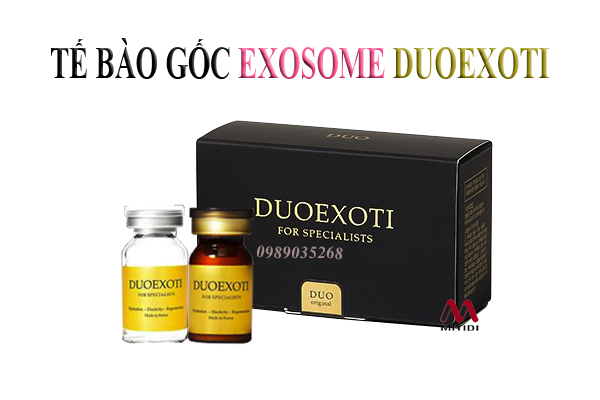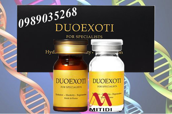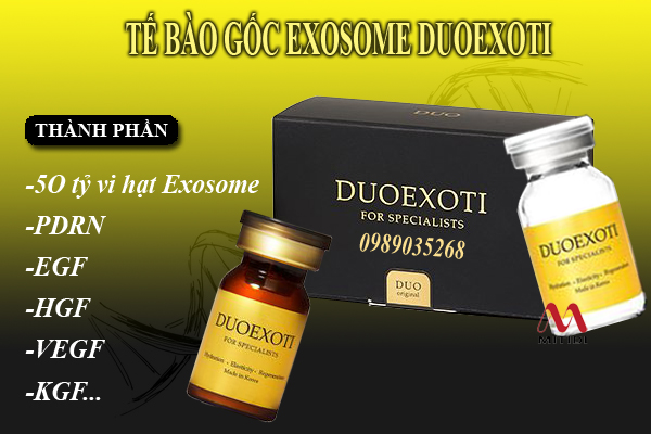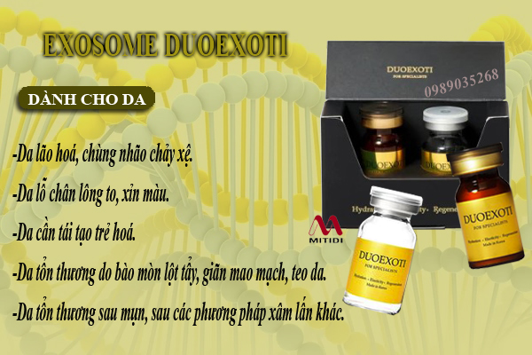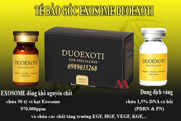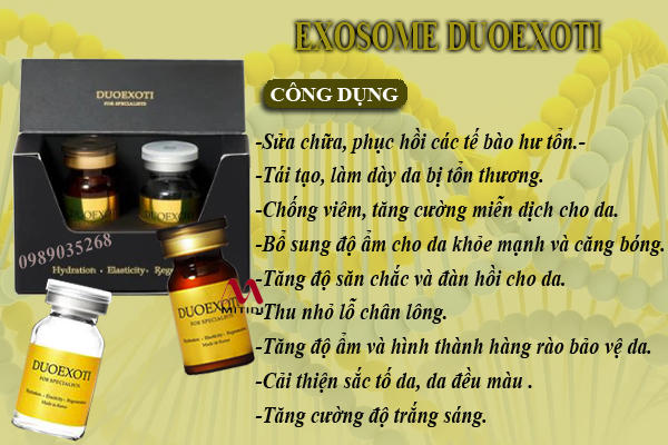 DUOEXOTI sở hữu 50 tỷ vi hạt exosomes tinh khiết không trộn lẫn với môi trường nuôi cấy, vì vậy nó rất tuyệt vời để trẻ hoá, tái tạo các tế bào da bị tổn thương, làm dày da và tăng cường Collagen. Exosome tế bào gốc trung mô là chất tiết từ tế bào gốc trung mô, chứa chủ yếu là miRNA, DNA, enzymes, chất tăng trưởng và các loại protein. Sự kết hợp thêm 1,5% PDRN tinh khiết giúp chữa lành vết thương và chống viêm tốt hơn. Sản phẩm giúp trẻ hóa và phục hồi làm dày da một cách thần kỳ và nhanh chóng.