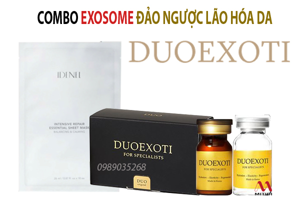 DUOEXOTI sở hữu 50 tỷ vi hạt exosomes tinh khiết không trộn lẫn với môi trường nuôi cấy, vì vậy nó rất tuyệt vời để trẻ hoá, tái tạo các tế bào da bị tổn thương, làm dày da và tăng cường Collagen. Exosome tế bào gốc trung mô là chất tiết từ tế bào gốc trung mô, chứa chủ yếu là miRNA, DNA, enzymes, chất tăng trưởng và các loại protein. Sự kết hợp thêm 1,5% PDRN tinh khiết giúp chữa lành vết thương và chống viêm tốt hơn. Sản phẩm giúp trẻ hóa và phục hồi làm dày da một cách thần kỳ và nhanh chóng.