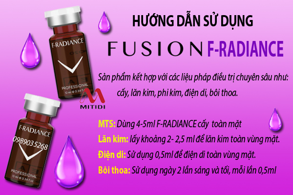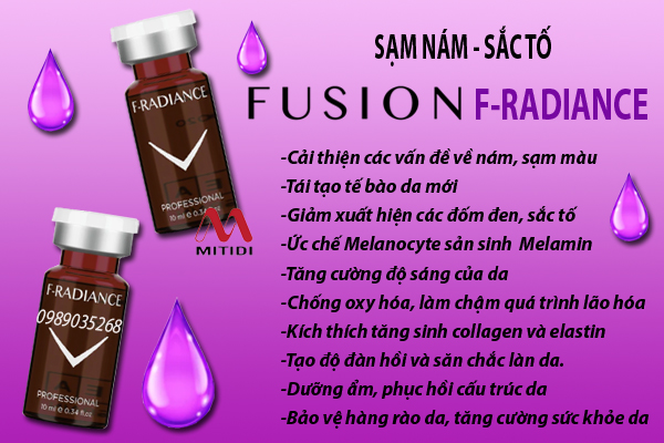 - Fusion F-Radiance chứa các thành phần giúp đẩy nhanh quá trình tái tạo tế bào da mới, giảm mật độ tập trung sắc tố
