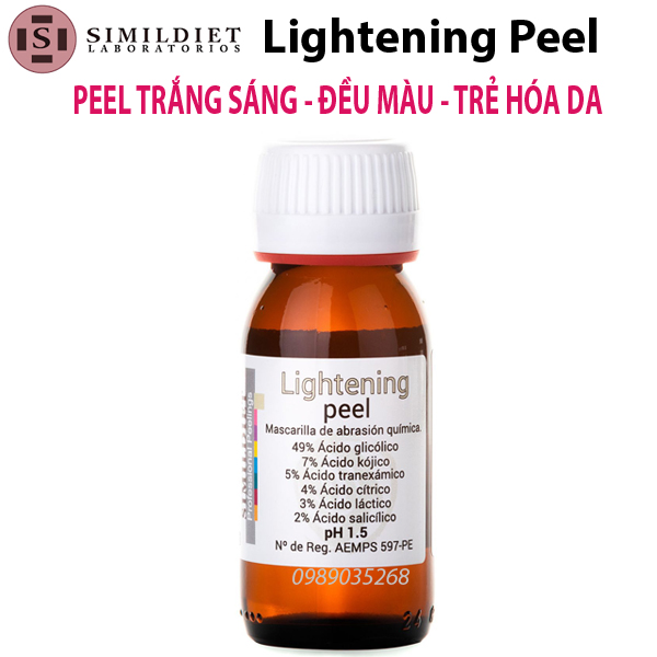 Peel trắng sáng da Simildiet Lightening Peel giúp làm sáng da, giảm sắc tố, ức chế hình thành sắc tố, làm đều màu da. Tẩy tế bào chết, làm bong tróc tế bào chết, tái tạo da.
