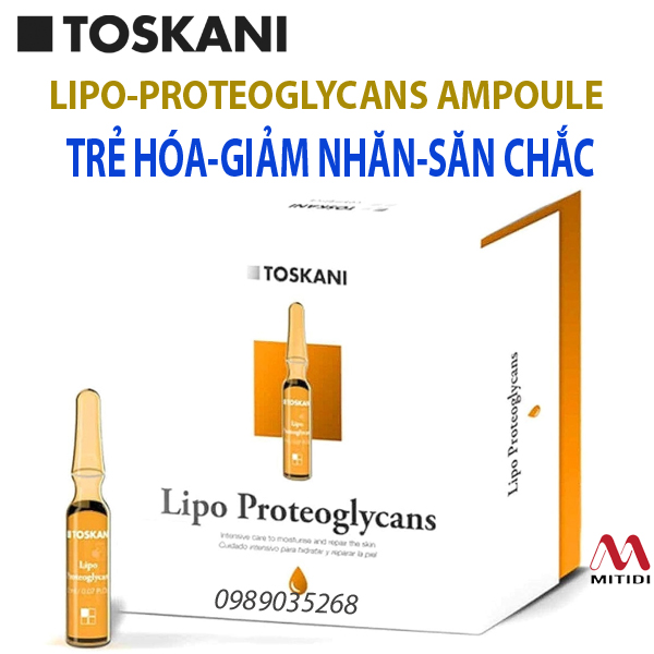 Trẻ hóa da, giảm nhăn TOSKANI LIPO-PROTEOGLYCANS AMPOULE là tinh chất cô đặc giúp sửa chữa các mô liên kết và kích thích sản xuất collagen,có nguồn gốc tự nhiên, giúp dưỡng ẩm sâu và có đặc tính làm săn chắc và phục hồi da hiệu quả. Phân tử Proteoglycans có khả năng giữ nước cao hơn 30% so với Hyaluronic Acid. Bên cạnh đó, phụ nữ từ độ tuổi 30 trở đi thường có lượng Proteoglycans dưới da bị suy giảm, do đó việc sử dụng sản phẩm thoa ngoài da có chứa Proteoglycans sẽ giúp bổ sung lượng bị thiếu hụt, tăng cường độ ẩm cho da, duy trì làn da khỏe mạnh.